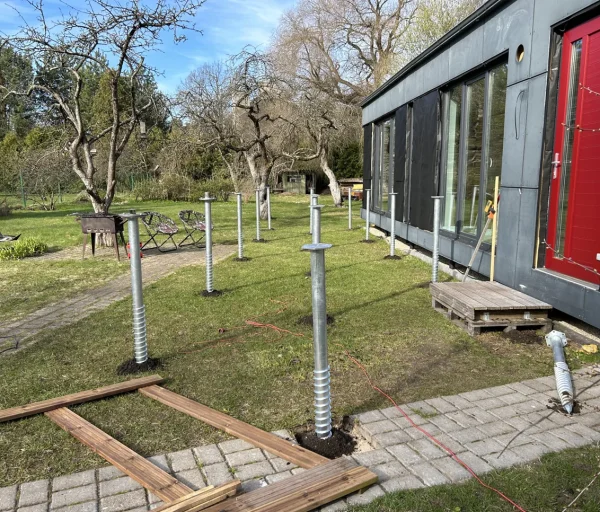 Montāžu veicam objektā, nodrošinot skrūvpāļu precīzu ieskrūvēšanu un līmeņošanu atbilstoši plānotajai konstrukcijai. Strādājam ar profesionālu elektrisko rokas reduktoru, kas ļauj montēt arī vietās ar ierobežotu piekļuvi un nebojājot teritoriju. Pamati pēc montāžas ir gatavi turpmākai būvniecībai tajā pašā dienā.
